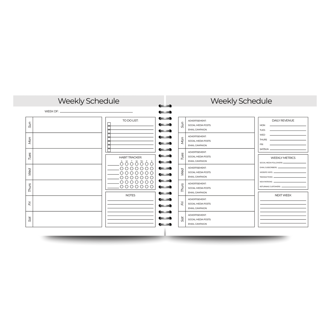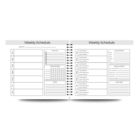 Your weekly spreads are structured around metrics, daily revenue tracking, audience growth, and business reflection. You are not just writing tasks. You are measuring progress.