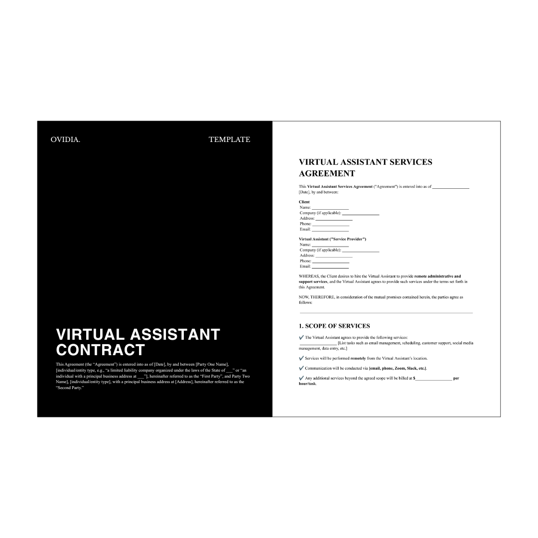 A strong virtual assistant contract shouldn’t feel intimidating — it should give both you and your client clarity, confidence, and a solid foundation for a professional working relationship. This Virtual Assistant Contract was created to help you define responsibilities, communication standards, payment terms, and boundaries in clean, approachable language that’s easy to customize and reuse.